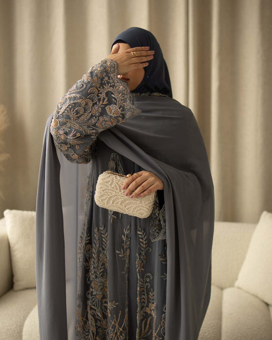 Aila Dusty Grey Embellished Organza Cape Abaya