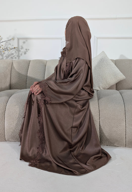 Womens Abaya Khadeejah Cocoa Satin Lace Abayas