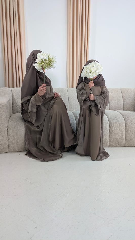 Girls Abaya Amina Junior Girls Brown Flared Tiered Sleeve Organza Abayas