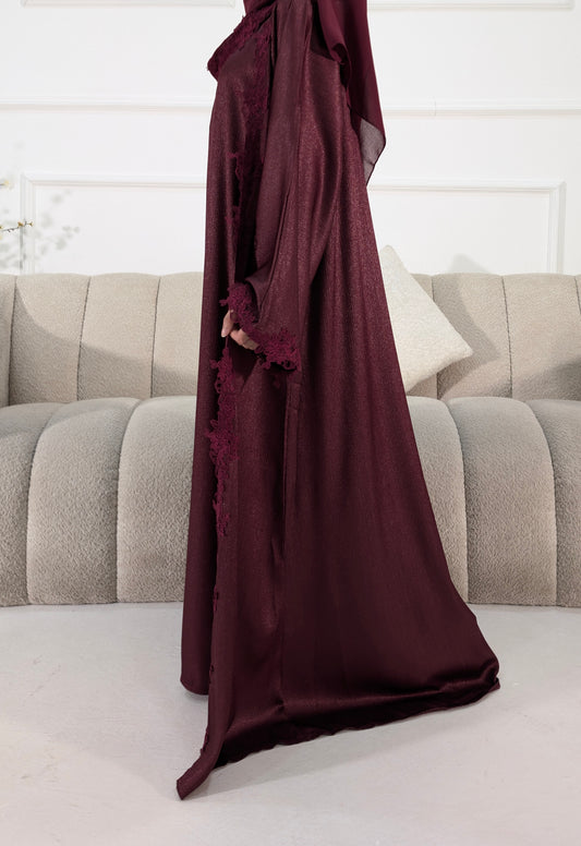 Womens Abaya Khadeejah Deep Burgundy Satin Lace AbayasRegular price £70.00 GBPRegular priceUnit price / per-