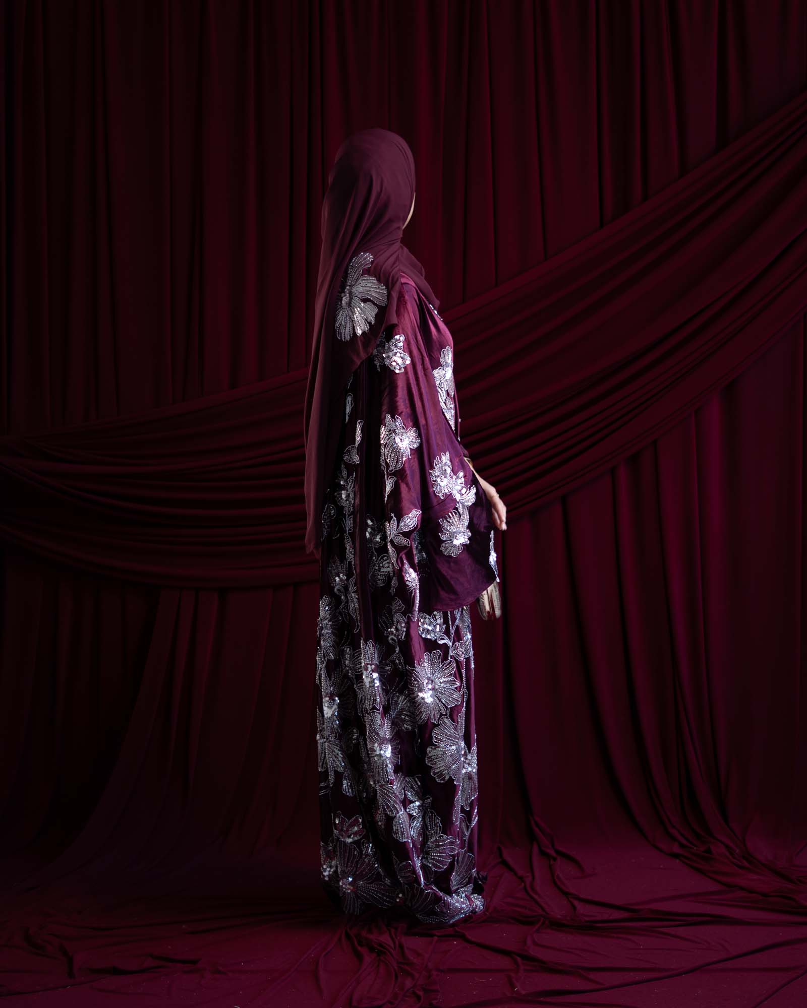 This elegant velvet abaya features intricate silver floral embroidery that shimmers beautifully against the soft fabric. The flowing silhouette drapes gracefully, offering both modesty and sophistication, while the matching headscarf completes the refined look. Perfect for formal gatherings or evening occasions, it blends timeless elegance with contemporary glamour.