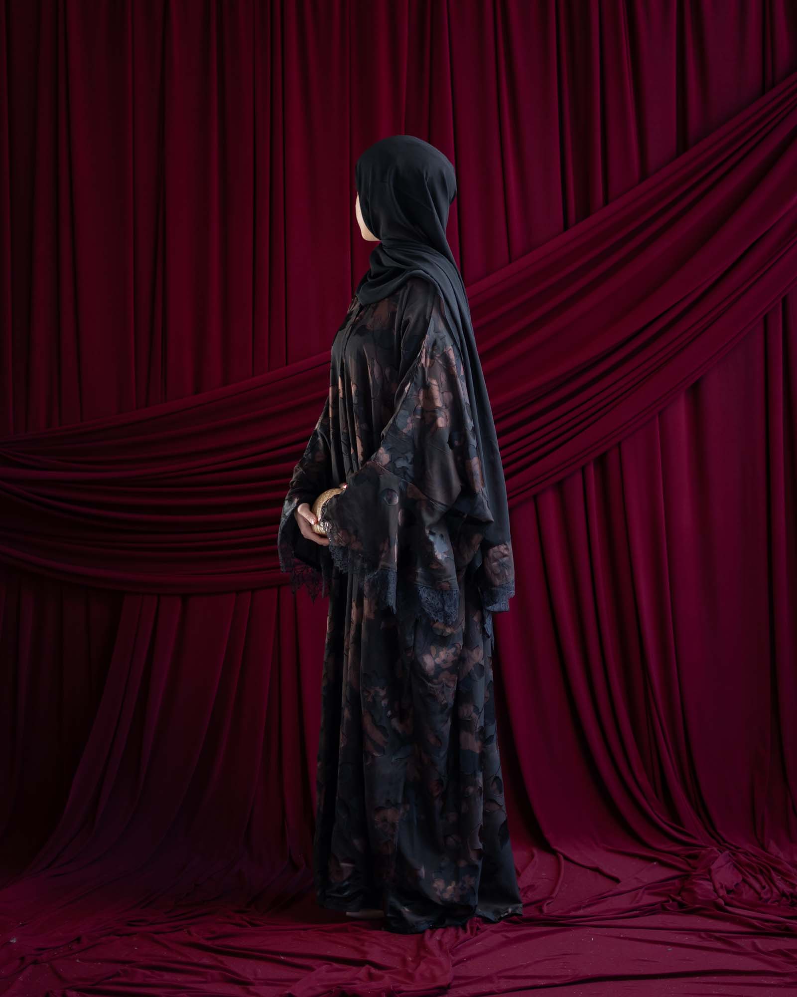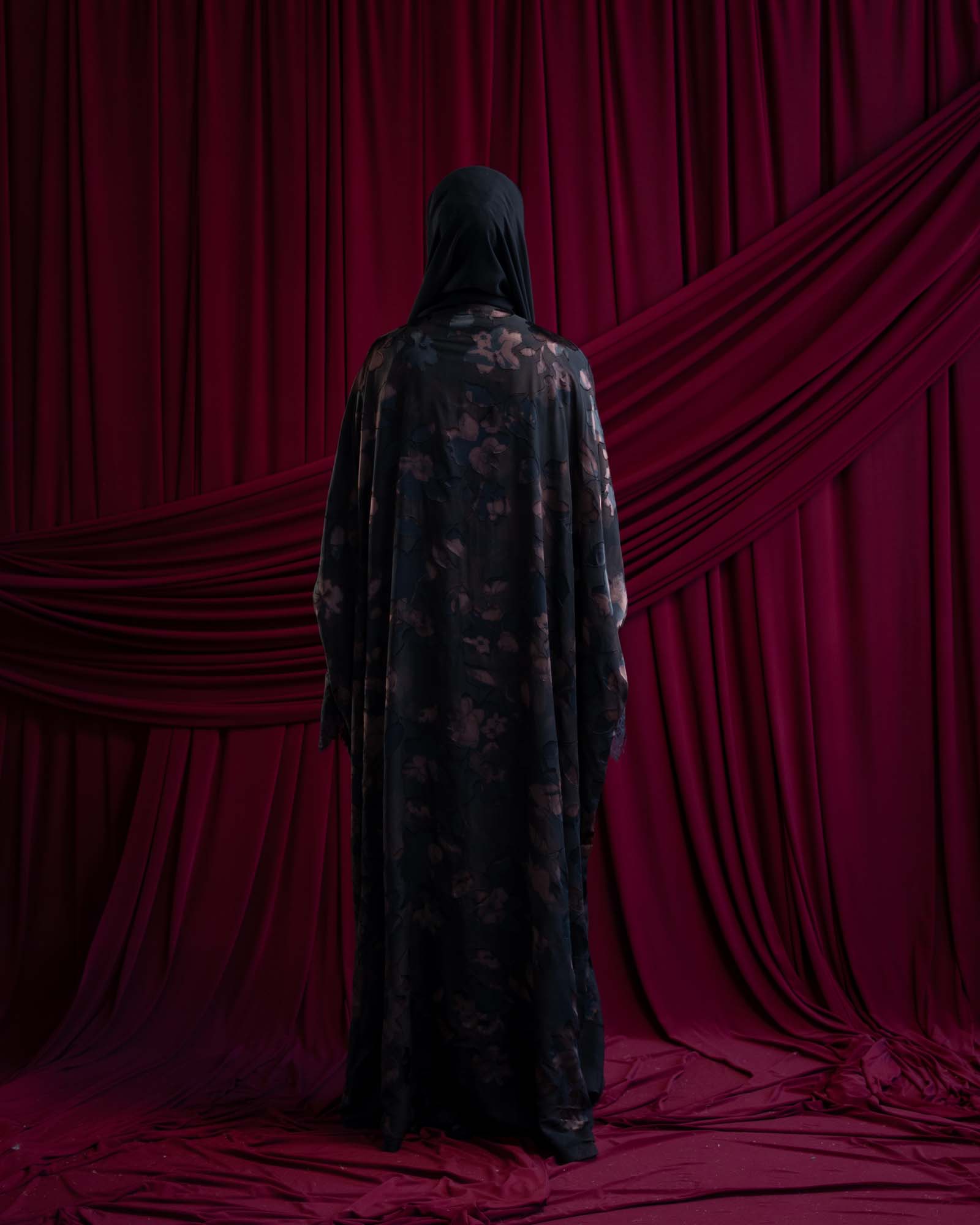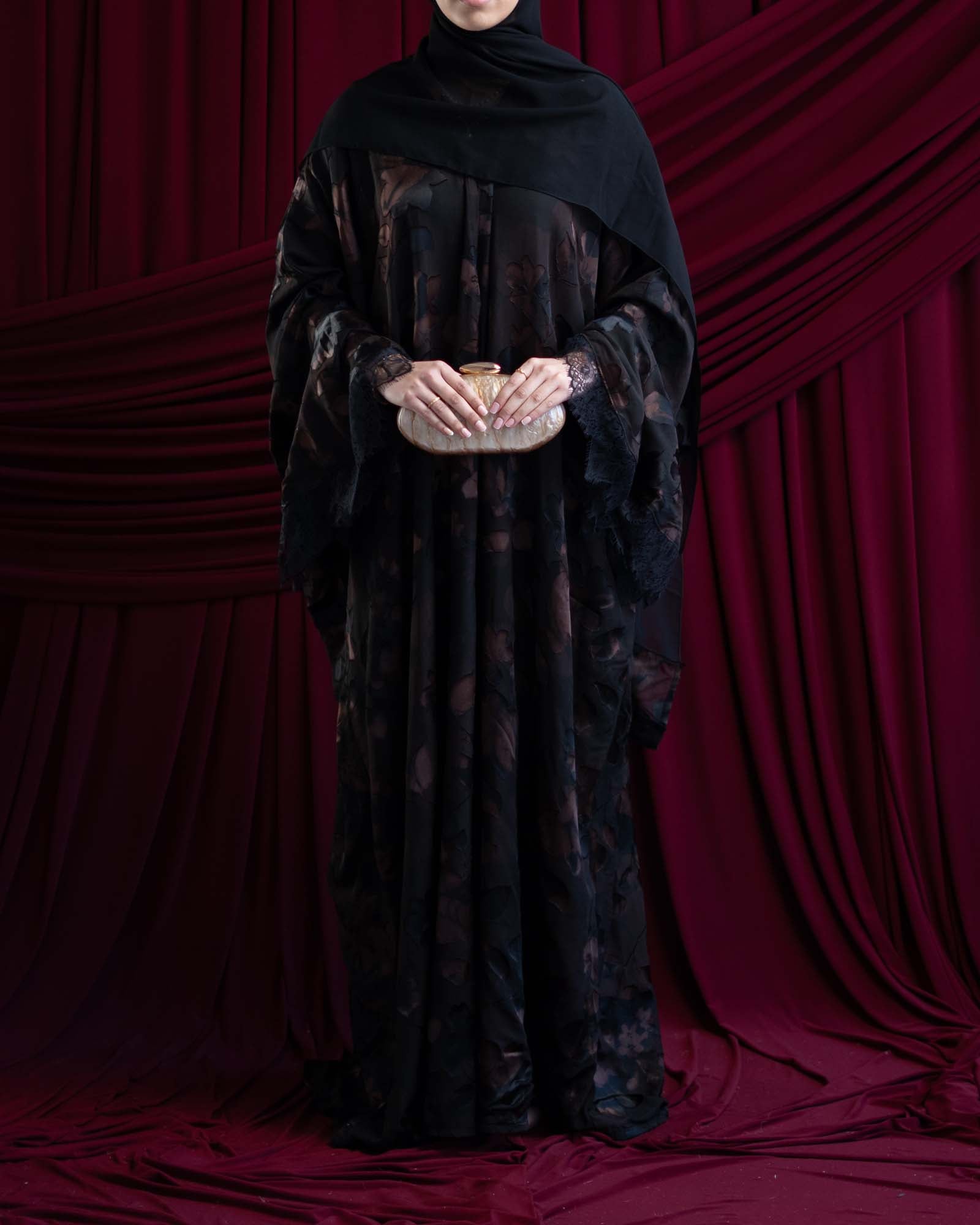 Grace meets statement elegance in this abaya. Designed in a flowing silhouette, this piece features rich floral textures layered over deep black fabric, creating a subtle yet captivating contrast. The wide, draped sleeves add movement and drama, while delicate detailing at the cuffs elevates its refined finish.