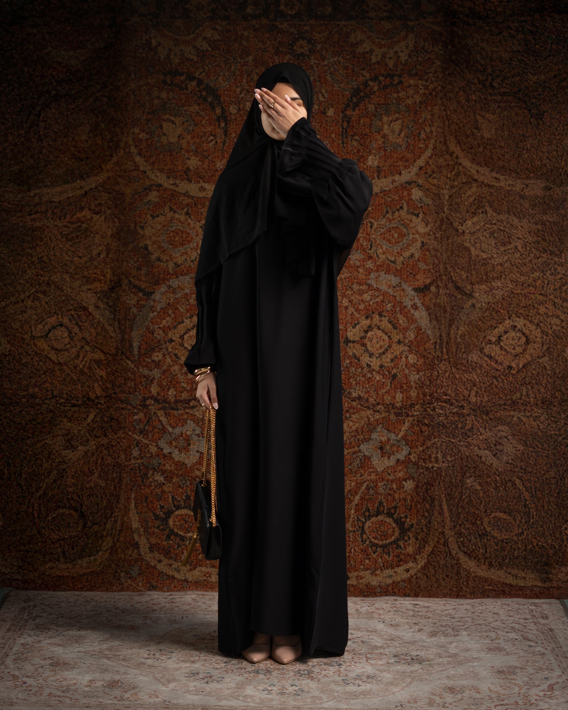 Elevate your modest wardrobe with this timeless abaya, designed with a graceful flowing silhouette and soft pleated sleeves for effortless elegance. Crafted from premium Korean Nida fabric, it drapes beautifully for all-day comfort while maintaining a refined, luxurious look. Perfect for everyday wear, special occasions, Ramadan, or formal gatherings, this abaya pairs seamlessly with a matching hijab and minimal accessories for a polished finish.