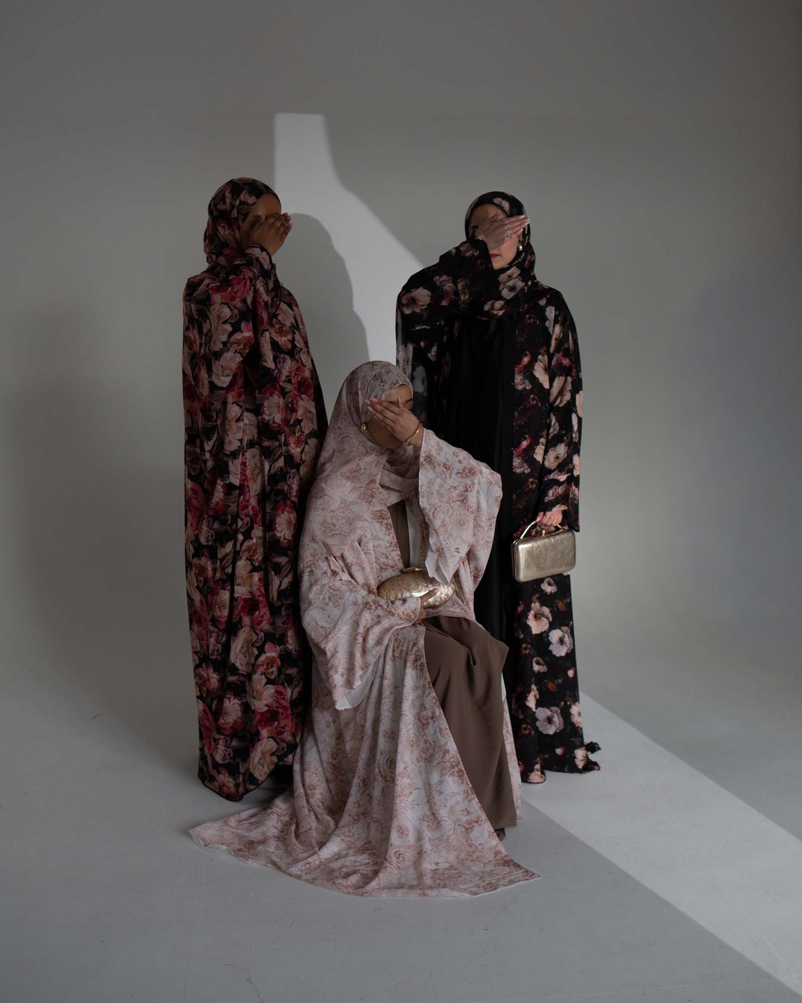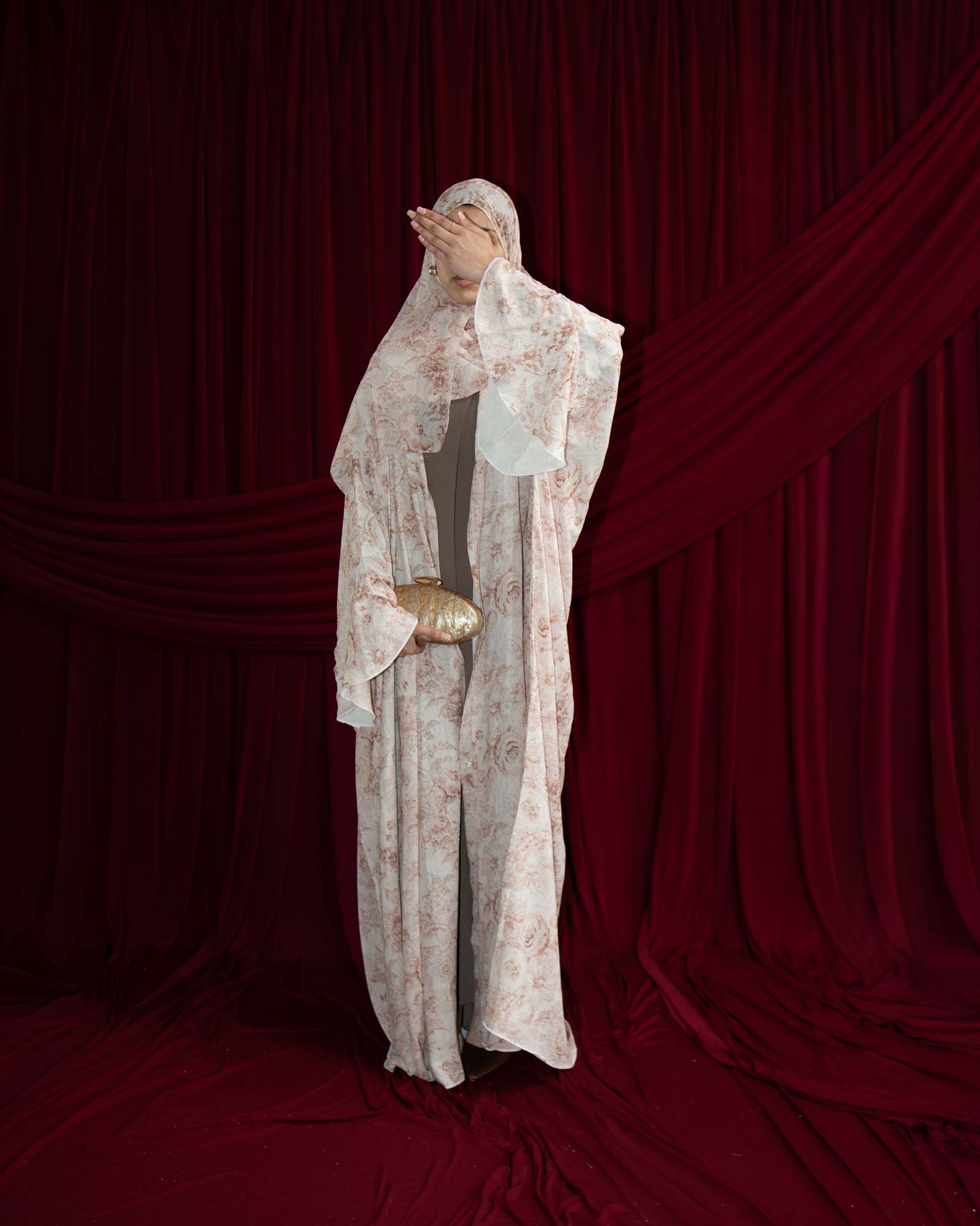 Bold, romantic, and effortlessly elegant — this abaya is a celebration of soft florals. Designed with a flowing silhouette and oversized draped sleeves, this piece features elegant brown florals perfectly set against a light beige base for a striking contrast.