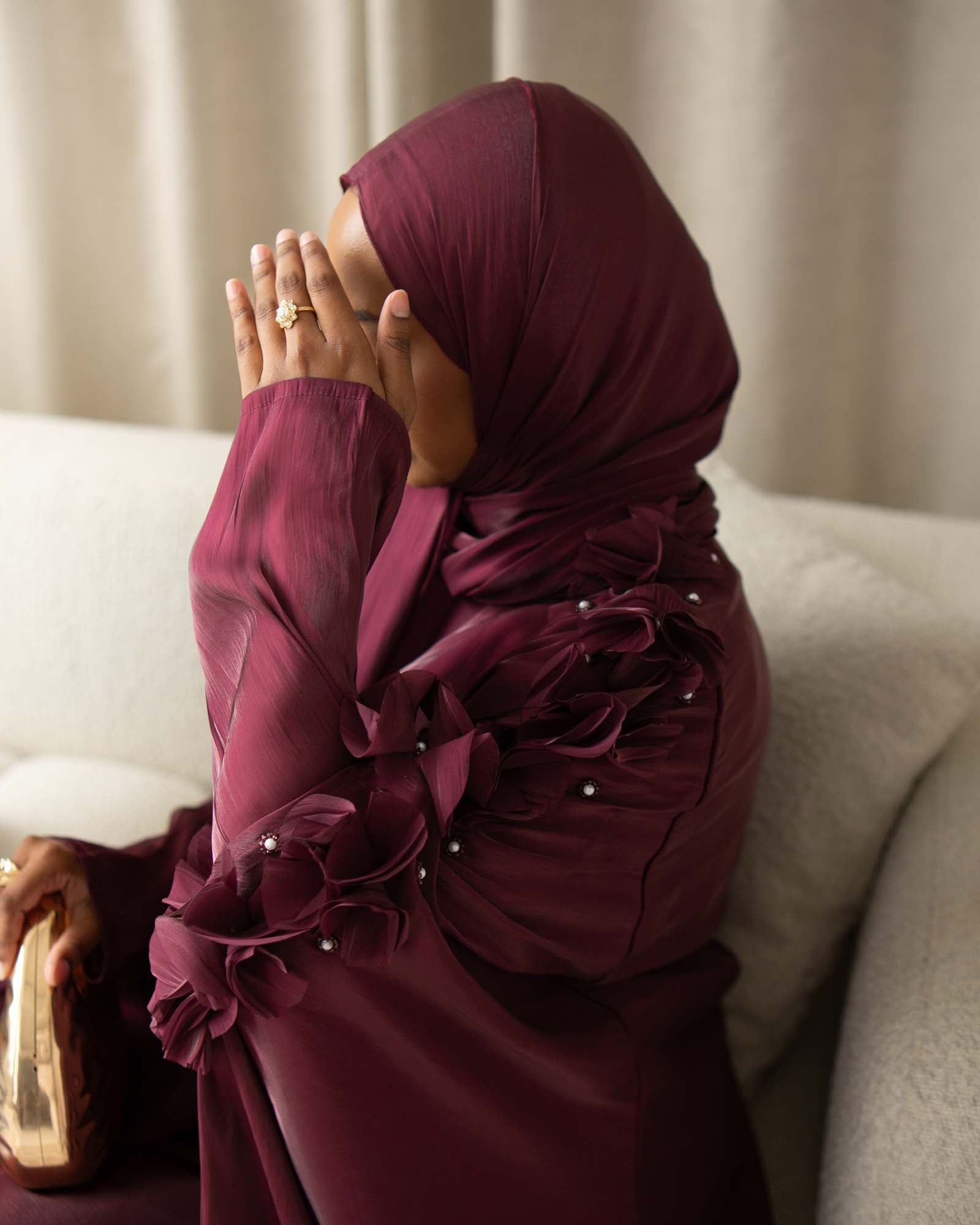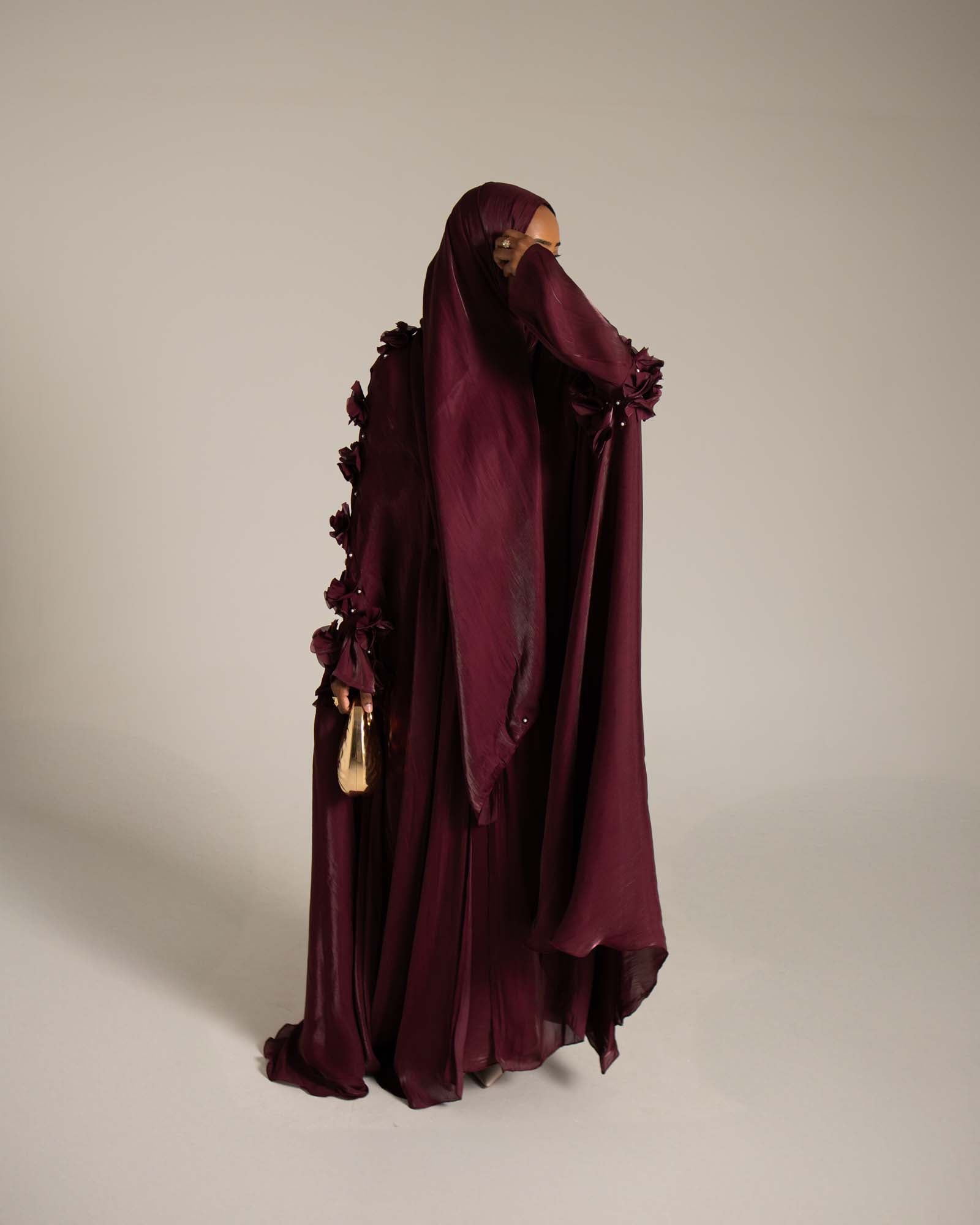 Step into elegance with our Deep Plum Luxury Organza Abaya, a stunning piece designed for the modern woman who values both modesty and high fashion. Crafted from premium, high-sheen organza, with 3D hand-embellished on the sleeves & shoulder to add texture and artistry to this standout piece. This evening abaya flows effortlessly with every movement, creating a sophisticated silhouette that turns heads at any occasion.
