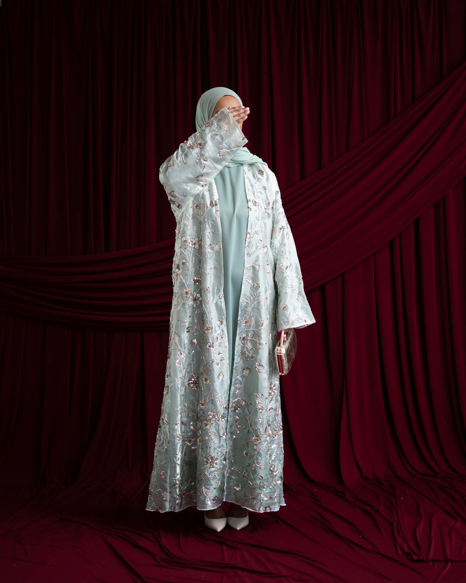 Elevate your modest wardrobe with this luxurious embroidered organza abaya, designed for timeless elegance and modern sophistication. Crafted from premium organza with intricate floral embroidery, this ombré features delicate metallic thread detailing that adds a subtle shimmer. The flowing maxi silhouette offers graceful movement, while the coordinating hijab completes the refined look.