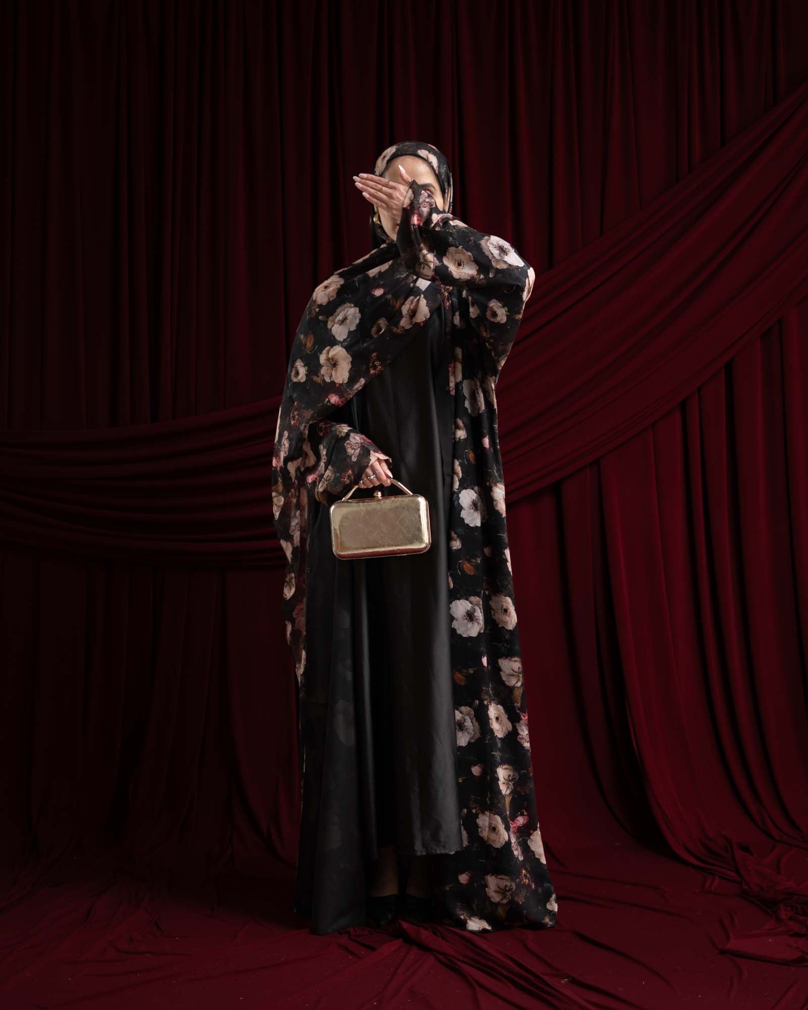 Bold, romantic, and effortlessly elegant — this abaya is a celebration of soft florals. Designed with a flowing silhouette and oversized draped sleeves, this piece features coloured florals florals perfectly set against black base for a striking contrast.