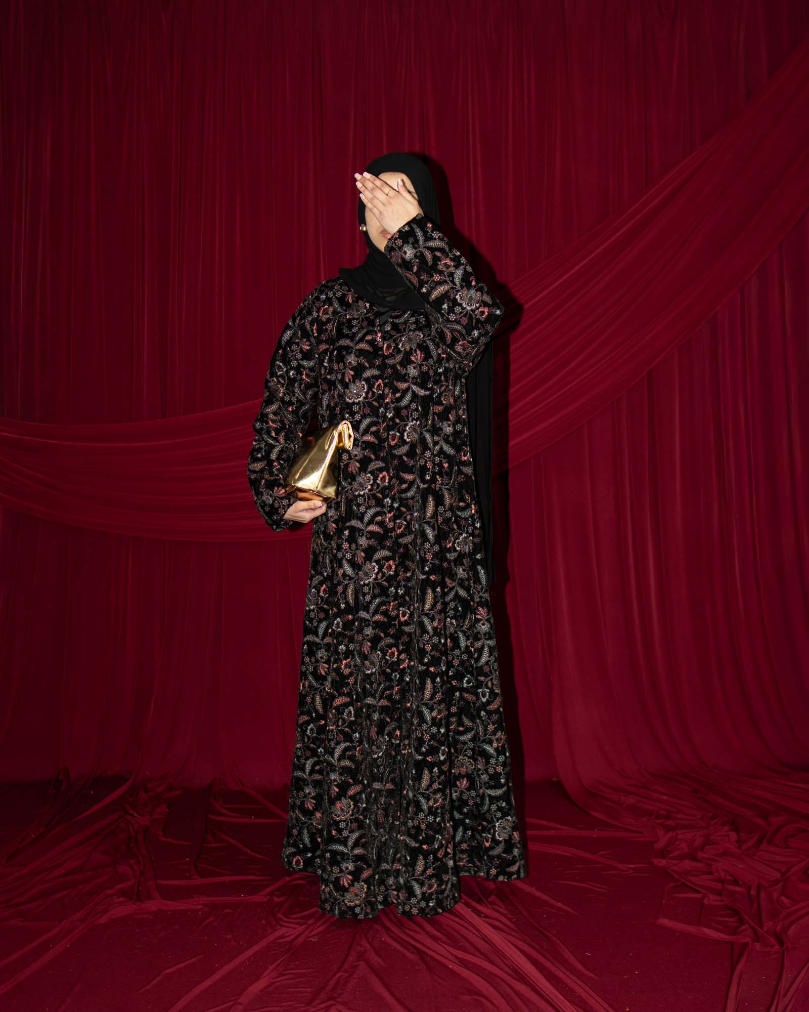 Crafted from premium velvet fabric, this full-length abaya features intricate floral embroidery woven throughout in subtle, rich tones. The delicate detailing adds depth and dimension while maintaining a refined, sophisticated look.