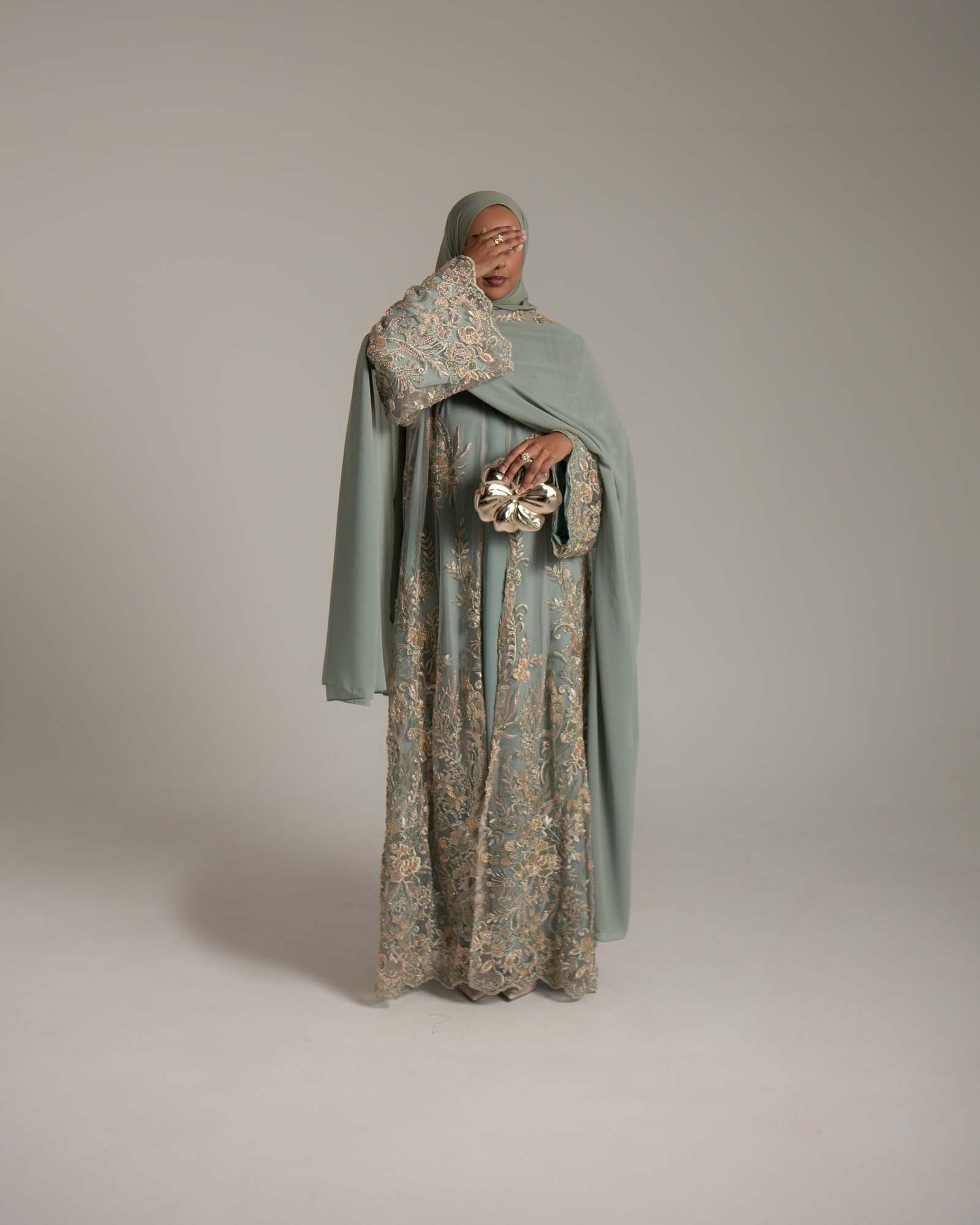 Zariyah Sage Green Embroidered Dupatta Abaya